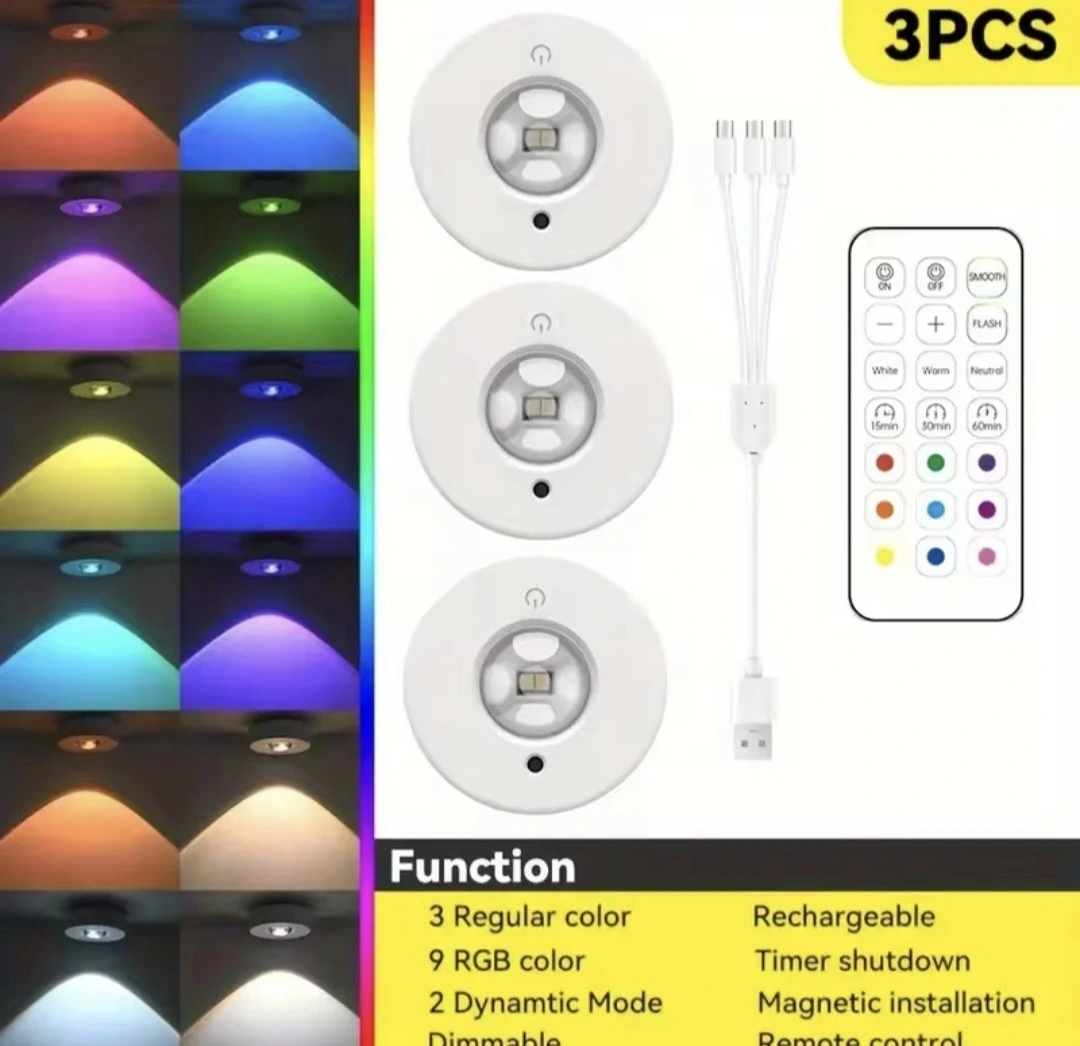 Compact but powerful. These rechargeable RGB lights bring fun color options anywhere—great for shelves, cabinets, or mood lighting.